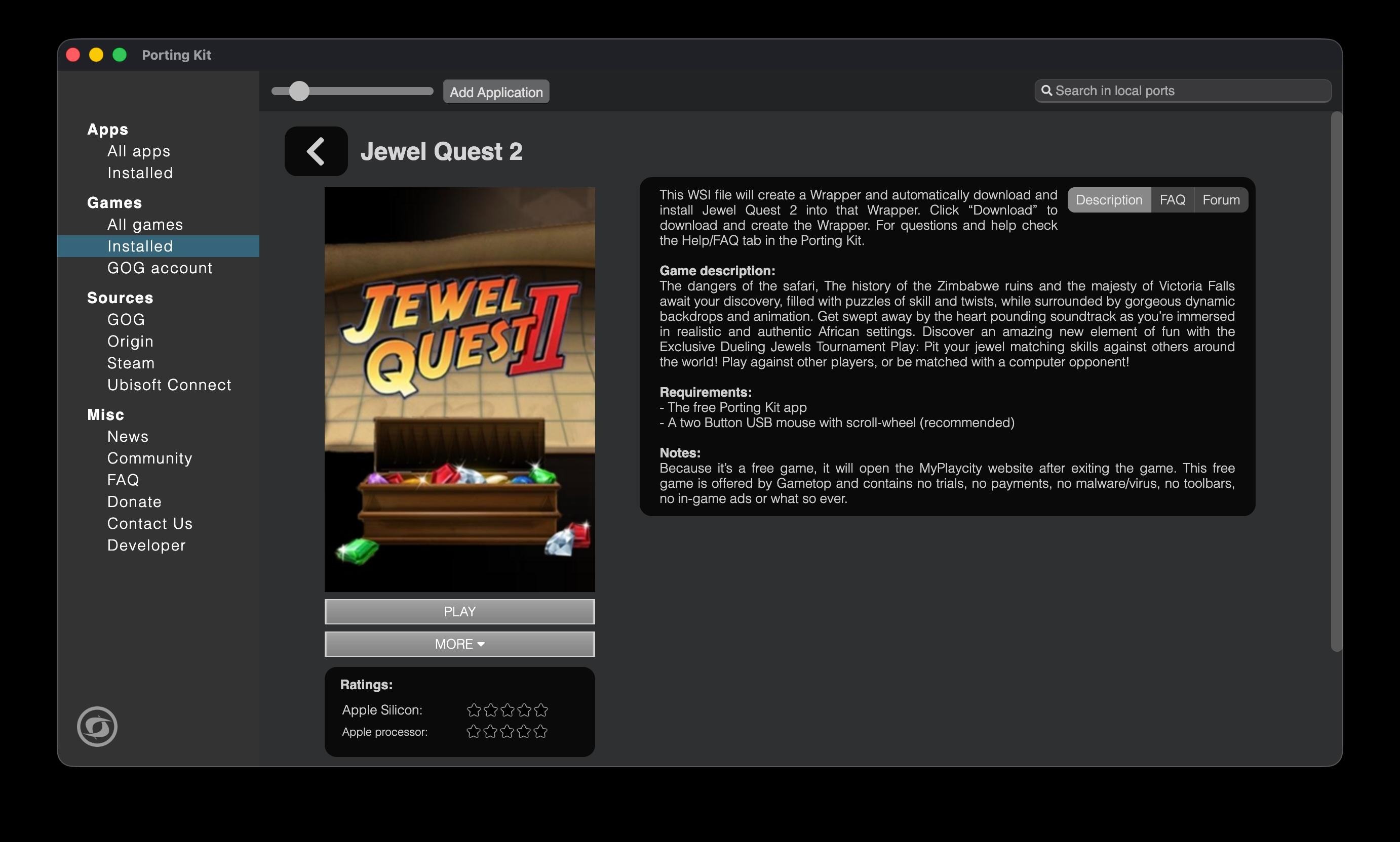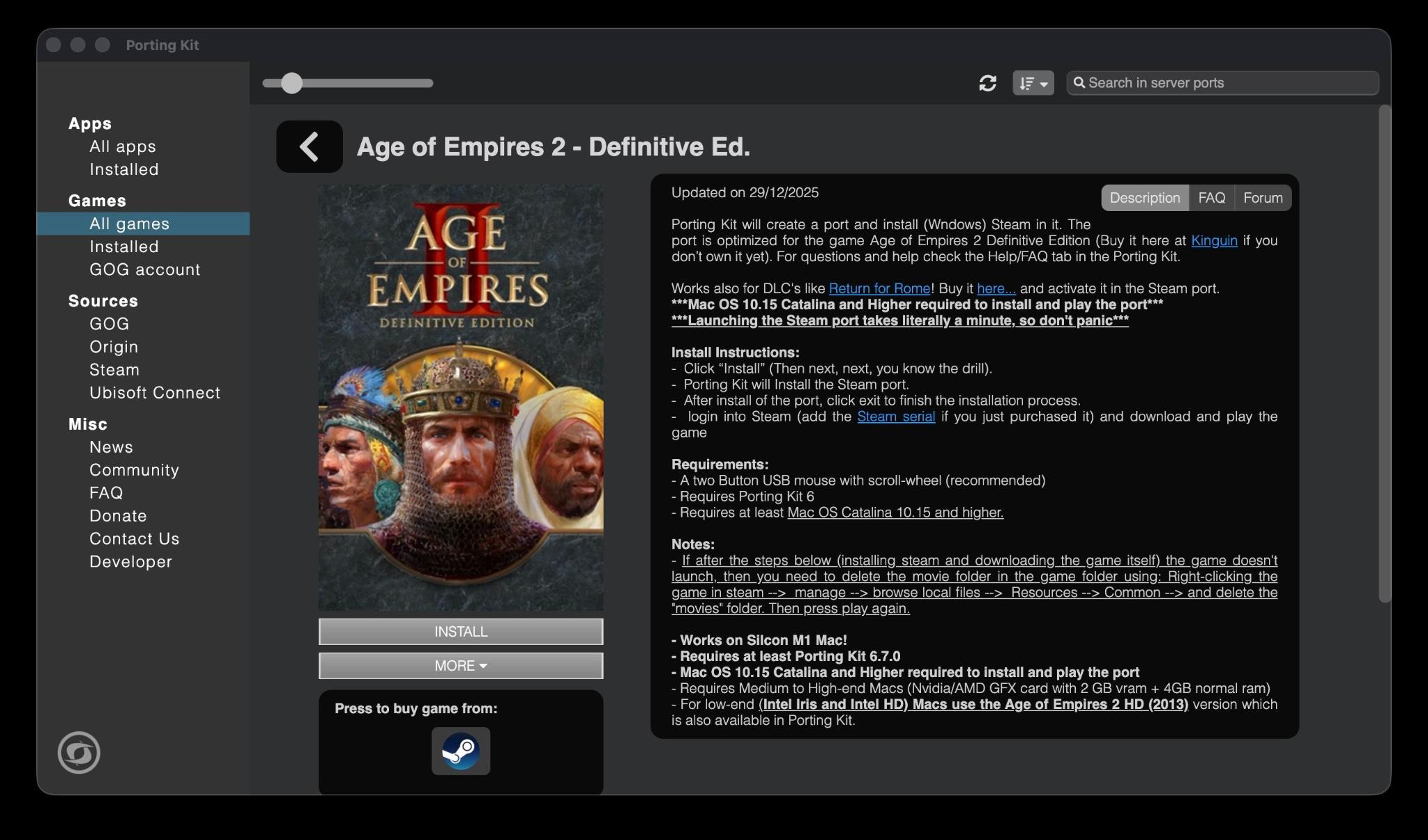 So what is Porting Kit?! Porting Kit is an free alternative application for Crossover or virtual machines like VM-ware, Fusion and Parallels Desktop. With this tool you can easily port many Windows games to your Mac and play it as you would on Windows. Almost 1500 popular games received there port so you can play it on your Mac! Awesome titles as Age of Empires 2 DE, Heroes of Might and Magic Series, Elder Scrolls series, Fallout Series, Red Alert 2, and many many more. More games ports are added regularly! We even have complete "Steam build" ports where potential many 1000nds of games are running in one port!! Check for the blog/news on the paulthetall.com website.